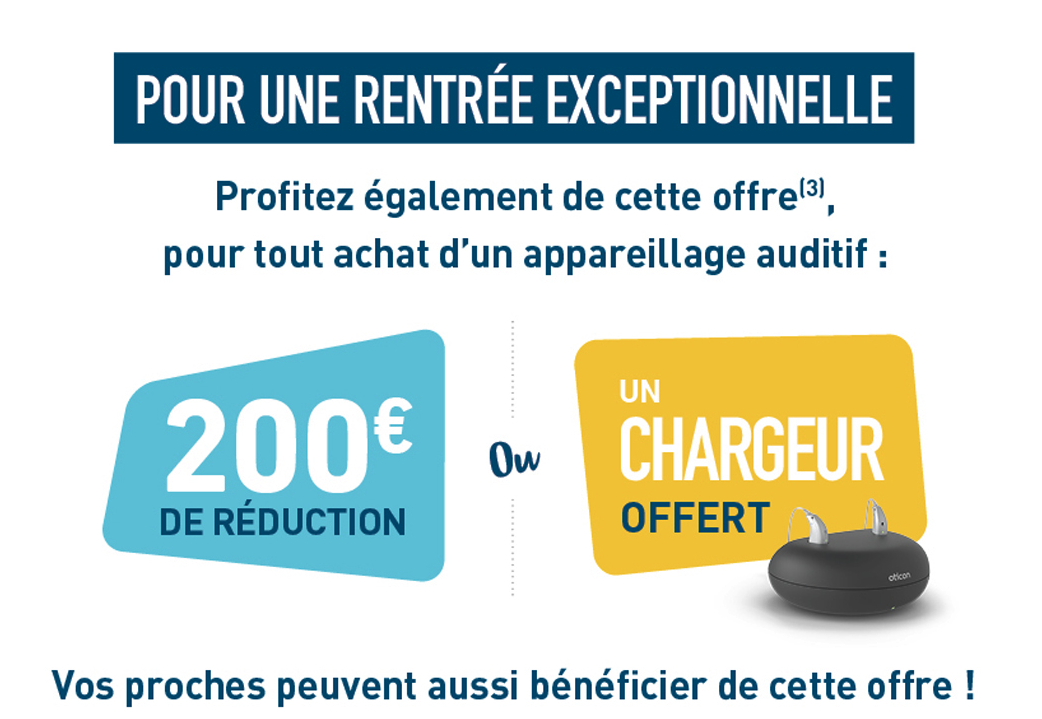 De plus, pour vous faire vivre une rentrée exceptionnelle, pour tout achat d’un appareillage auditif, nous vous proposons de bénéficier de -200€ ou d’un chargeur offert pour tout achat d’un appareillage auditif(3). Notre gamme d’appareils 100% remboursés(4) est également disponible dans votre centre Audilab.