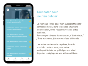 Je note les situations sonores qui me posent problème, et les améliorations que je constate. Ainsi, je suis sûre de ne rien oublier lors d’un futur rendez-vous. J’utilise parfois l’enregistreur audio, car ce n’est pas toujours facile de trouver les mots justes pour expliquer à mon audioprothésiste les ambiances sonores où je ne suis pas très à l’aise.