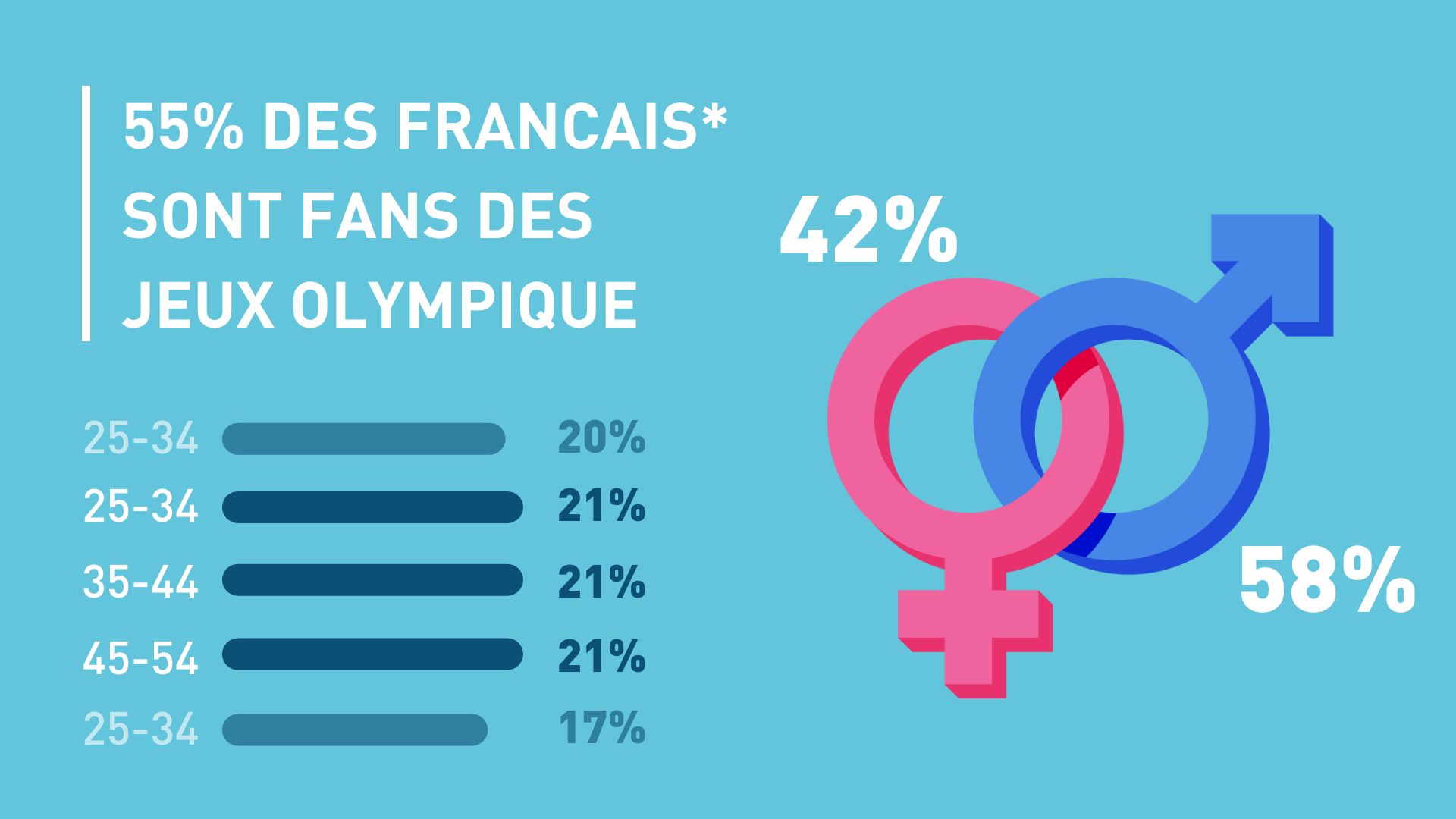Si une majorité d’hommes suit les Jeux Olympiques, la distribution par genre est bien plus équilibrée comparée au Tour de France (58% d’hommes et 42% de femmes pour les JO) contre 67% et 33% pour le Tour de France. La répartition par âge est aussi plus équilibrée, et plus jeune : 62% des fans des JO ont entre 16 et 45 ans, contre 57% pour les fans du Tour de France. (Source)