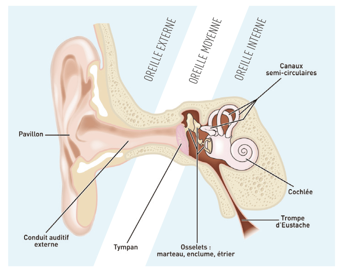 L’oreille humaine se compose de trois parties : l’oreille externe, l’oreille moyenne et l’oreille interne. Chacune correspond à un milieu de propagation du son différent. Pour qu’une bonne audition soit possible, il faut une action combinée de plusieurs fonctions. Afin de bien comprendre, suivons le chemin du son jusqu’à sa perception :