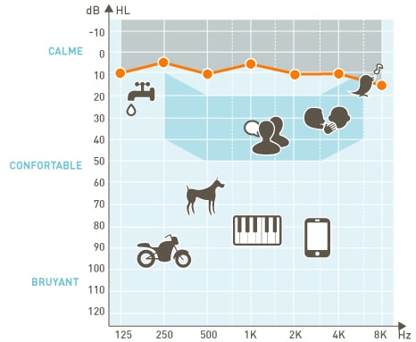 - Perte auditive légère (entre 20 et 40 dB) : entend une conversation si une seule personne parle normalement, les bruits familiers ambiants sont perçus ;